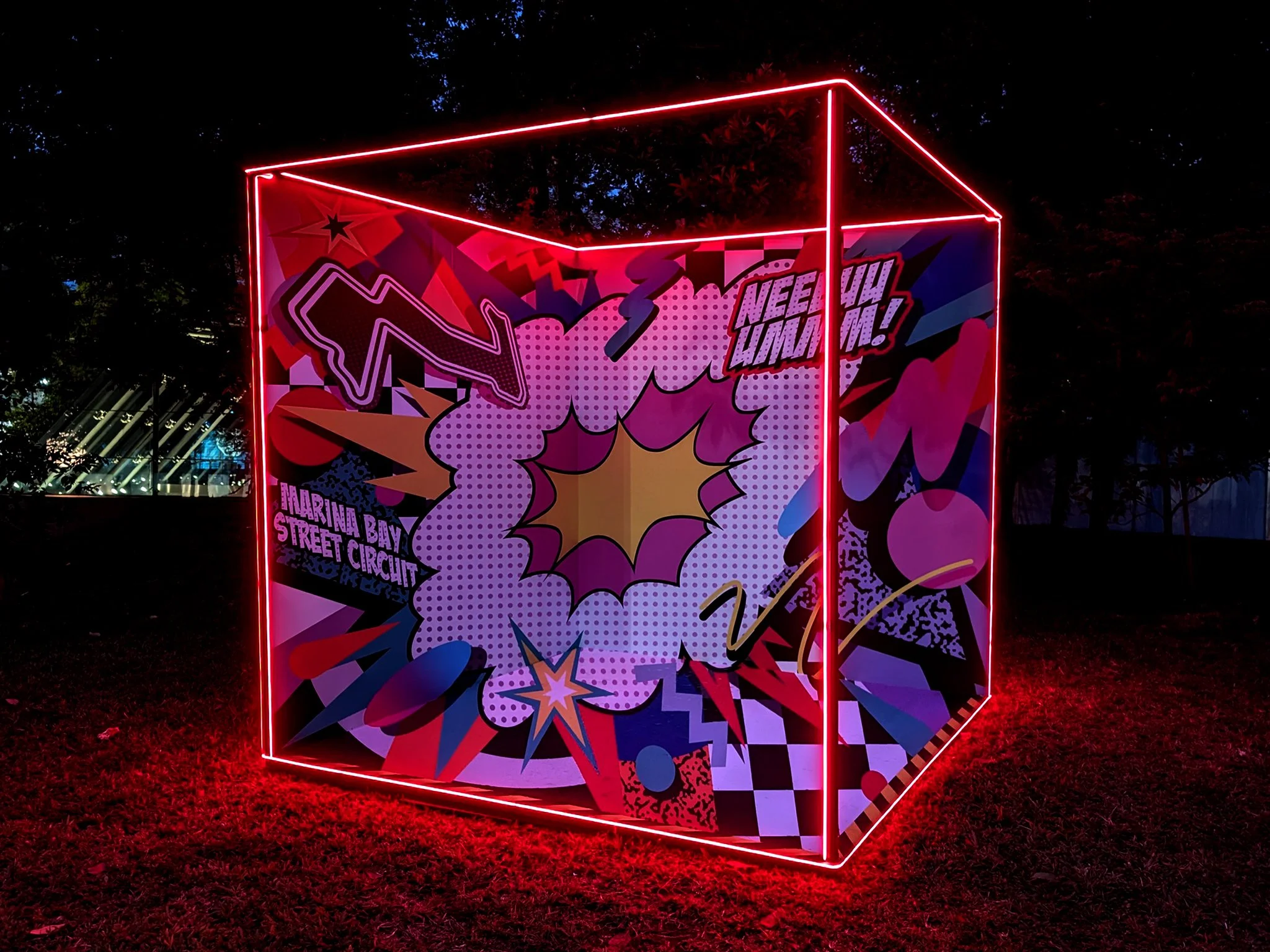 For this year's Singapore Grand Prix, we were commissioned to craft two striking anamorphic structures that captivate and inspire. The first is a mesmerizing lenticular light box, designed to produce a dynamic, shifting visual illusion that embodies speed, innovation, and energy, immediately drawing the crowd’s attention. The second is a vibrant, pop-inspired LED cube that perfectly complements the lively music lineup, pulsating with colorful, rhythmic lights that energize the environment.